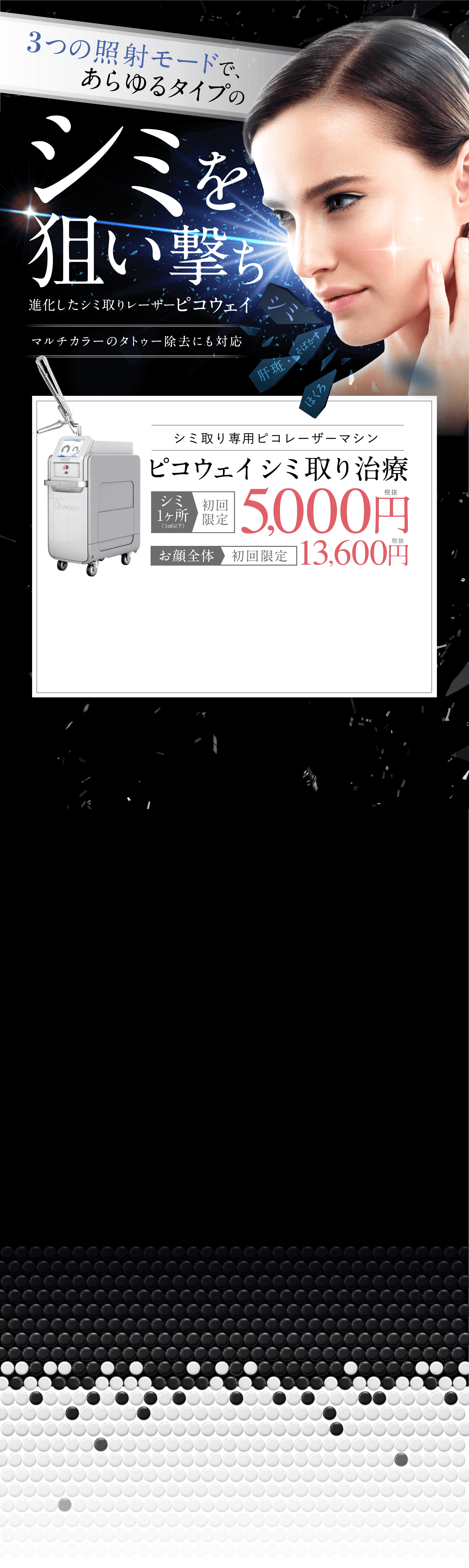 あらゆるタイプのシミ、ソバカス、黒子をすばやく治療する、進化したレーザー治療です。除去が困難とされていた刺青・タトゥーも治療が可能です。シミ治療で一般的なレーザーマシンの照射時間「ナノ秒(10億分の1秒)」よりはるかに短い、わずか「ピコ秒(1兆分の1秒)」単位でレーザーを照射します。照射時間が極めて短いことで、熱発生がほとんどないため、痛みや皮膚へのダメージが軽減されます!